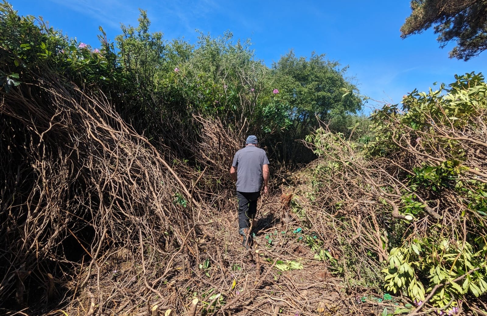 The growth of R.ponticum on Gigha is multi-stemmed due to the wind and salt pressure of their coastal environment. Like R.ponticum across much of Argyll, it does not grow into mature trees, but uses its ability to spread smaller branches outwards and underneath the ground which then produce multiple shoots from one branch, making the stands extremely dense, intertwined, and often impenetrable. When compiling a brief for contractors, it was difficult to relay how extensive the stands were, meaning more difficult work than expected, unrealistic budgets, and longer treatment times.